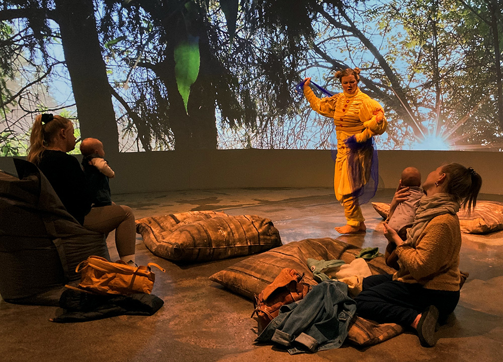 Esitys on levollinen hetki, jossa sekä vauva että aikuinen voivat rentoutua ja kokea asioita yhdessä. Se johdattaa osallistujat lämpimään oravan pesään, josta voi tarkkailla maailman menoa.